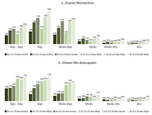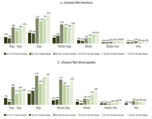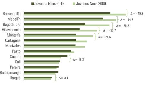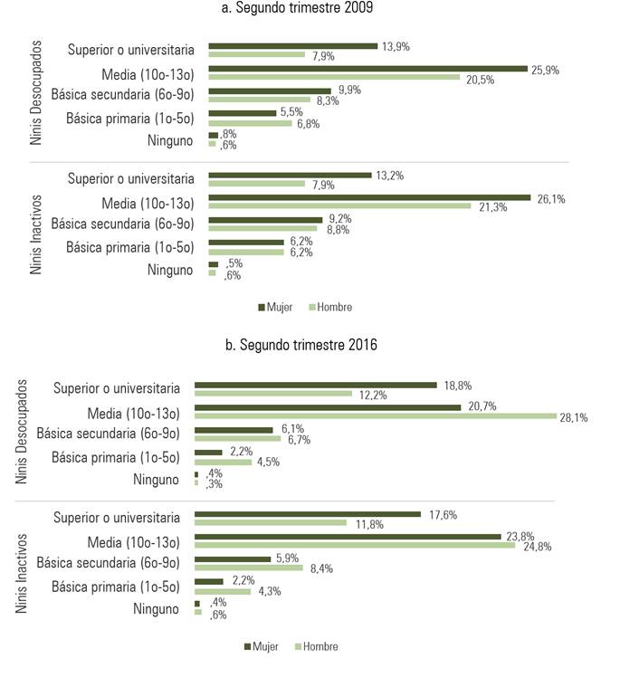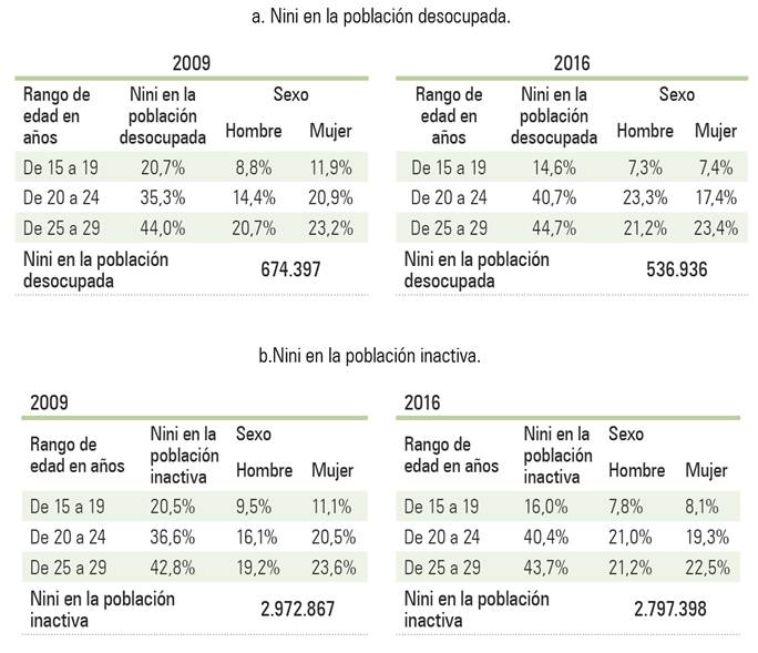 En contraste, en el 2016, los jóvenes Nini disminuyeron 8,6%. Sin embargo, esta reducción tiene unas características particulares en relación al 2009. Tanto para los Nini provenientes de la población desocupada, como para los inactivos, solo se registraron disminuciones en los rangos de los 15 a los 19 años de edad. En contraste, los rangos de los 20 a los 24 y de los 25 a los 29 años mostraron incrementos entre ambos trimestres, lo que se interpreta como una disminución general en la juventud Nini entre los 15 y los 19 años entre el II trimestre del 2009 y el 2016 acompañada de un incremento de estos entre los 20 y 29 años de edad. Al analizar los datos por género, en 2009 se observa la mayor proporción de Ninis en las mujeres (55,3%), mientras que en 2016 la mayor concentración recaía en los hombres (50,3%).