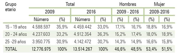 Del total de la población joven en el 2009, 6.952.517 se encontraban ocupados, 1.094.693 desocupados y 4.729.765 eran inactivos. Para el segundo trimestre del 2016 los jóvenes ocupados se incrementaron en 12,8% (7.841.595), los desocupados disminuyeron en 18,7% (890.112) y los inactivos se incrementaron en 1,11% (4.782.560).