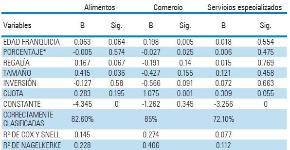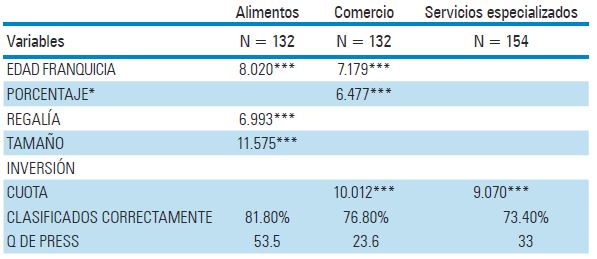 Los resultados del análisis discriminante (Tabla 2) y de la regresión logística binaria (Tabla 3) confirman, por diferentes métodos, el poder discriminatorio significativo de las variables independientes en los tres sectores de estudio. Adicionalmente, el porcentaje de franquicias correctamente clasificadas muestran resultados muy similares al evaluarlos por los dos métodos.