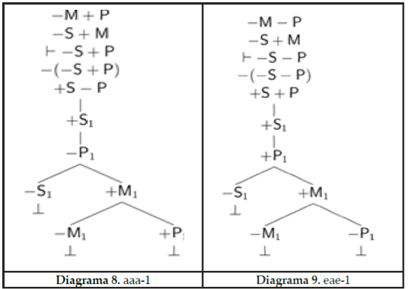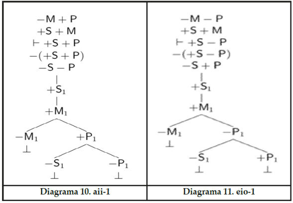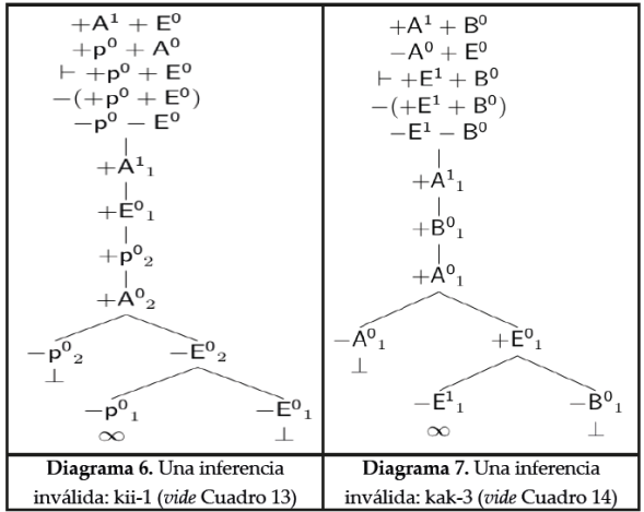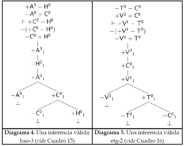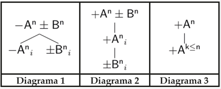 El Diagrama 1 ilustra la regla para las proposiciones de tipo universal; el Diagrama 2, la regla para las proposiciones intermedias; y el Diagrama 3, la regla de ordenamiento para los términos positivos, con n,k ∈{0, 1, 2, 3}. Notemos, además, que después de aplicar una regla introducimos un subíndice i∈{1, 2, 3, ...}. Para las proposiciones universales el subíndice puede ser cualquier número natural; para las proposiciones intermedias, el subíndice tiene que ser un nuevo natural si dichas proposiciones no tienen ya un subíndice asociado. Adicionalmente, y siguiendo los principios de TFL, asumimos las siguientes reglas de negación: −(±A) =∓A, −(±A±B)=∓A∓B y −(−−A−−A)=+(−A)+(−A).