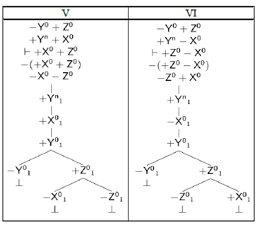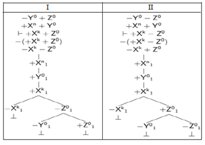 Para este caso, considerando únicamente las inferencias TFL+ válidas que aparecen en el Cuadro 12, existen dos formas generales de conclusión a considerar, a saber, +Xk±Z0 y +X0±Z0. Ahora, como el árbol es completo, las reglas para generar dicho árbol deben haber sido aplicadas; y como el árbol es cerrado, cada árbol debe ser de una de las siguientes siguientes formas (Diagramas 14 y 15):