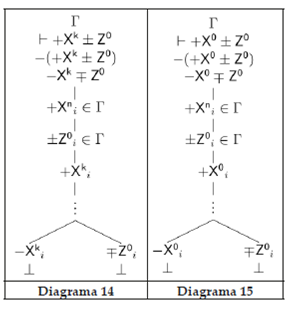 Supongamos, entonces, que tenemos una instancia del árbol del Diagrama 14 pero que su correspondiente inferencia no es válida, es decir, donde Γ+=Γ∪{-Xk∓Z0}, Γ+⊢⊥, pero la aplicación de las condiciones de inferencia de TFL+ a Γ no nos permite producir +Xk±Z0, con k<n. Ahora bien, siguiendo las ramas del árbol del Diagrama 14 observamos que las puntas están cerradas, por lo que en nodos previos el árbol tiene que incluir algo de la forma +Xk y ±Z0, es decir, Γ={…, +Xk, ±Z0, …}. Pero si esto es así, si aplicamos la regla i) (i.e. la suma) a Γ obtenemos algo de la forma +X±Z, y no al revés, por la condición ii) (cantidad de particulares); y por último, por la condición iii) (nivel de cuantificación), la conclusión tiene que ser algo de la forma +Xk±Z0 con k<n. Sin embargo, esto último contradice la suposición de que no podemos construir una prueba de tal conclusión usando las condiciones de inferencia de TFL+. Lo mismo ocurre para el árbol del Diagrama 15 que es un caso particular del Diagrama 14 cuando k=0.