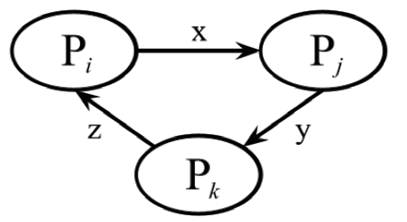 Este grafo G2 está conformado por tres nodos pi, pj y pk, y tres lados x, y, z tales que: x = <pi, pj>, y = <pj, pk> y z = <pk, pi>. Supóngase un mapeo f tal que: f(pi) = pj, f(pj) = pk y f(pk) = pi. La rotación de los nodos en G2 que hace la función f no genera ninguna diferencia en su estructura. Un grafo, sin embargo, en el que ningún mapeo de sus nodos es un automorfismo no-trivial se denomina un grafo asimétrico. El grafo G1 arriba es precisamente un grafo asimétrico con esta característica. En un grafo asimétrico la identidad de cada nodo puede ser fijada por su posición en la estructura y nada más que por tal posición en la estructura. Cualquier mapeo no trivial de los nodos de G1 -esto es, un mapeo que no sea la identidad- no preservaría su estructura. Basta para esto considerar, por ejemplo, la hipótesis de un mapeo del nodo 6 en el 5, y el 5 en el 6. El nodo 6 sólo está conectado con el nodo 4, mientras que el nodo 5 está conectado con los nodos 4, 2 y 1. Estos son rasgos perfectamente generales de estas estructuras que no dependen de cuál sea la naturaleza intrínseca de los nodos, o de los lados entre los nodos. La teoría de grafos, entonces, ofrece una respuesta formal acerca de cómo es que una estructura conformada por un plexo de relaciones puede ser aquello que constituye la identidad de los relata en ella.