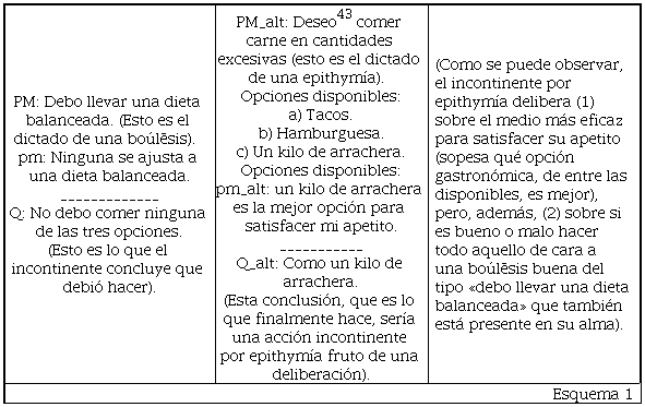 Así pues, he aquí la diferencia, a la luz de la boúleusis, entre el incontinente por epithymía y por thymós: aunque ambos son capaces de la deliberación sobre medios y fines, sólo el incontinente haplỗs lleva a cabo aquella otra deliberación que le indica que todo lo que se dispone a realizar está moralmente errado. Veamos cómo quedarían los silogismos de los incontinentes que no se limitan a obedecer a su deseo irracional sino que, además, para ello se valen de una deliberación. Primero, del incontinente haplỗs: