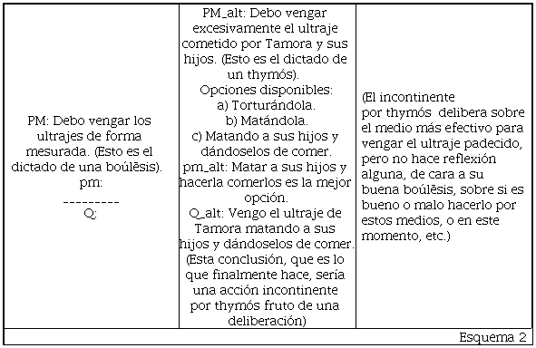 Como podemos observar, de cara a tres alimentos, y con dos deseos opuestos por dentro, el incontinente por epithymía lleva a cabo un doble ejercicio deliberativo: el primero, la deliberación con base en su epithymía para hallar qué medio es el óptimo para satisfacer su apetito;44 el segundo, la deliberación con base en su boúlēsis buena con la cual él concluye qué no debe hacer y cuyo resultado no acata. Esta última deliberación es la que no lleva a cabo el incontinente por thymós -no hasta que se le pase la ira, claro-. Siendo así, cuando Tito Andrónico, en la tragedia del mismo nombre, descubre quiénes fueron los autores materiales e intelectuales de la violación y mutilación de su hija amada, no delibera sobre si matar a los culpables está bien o mal; solamente, frente a la afrenta, delibera sobre qué medio es mejor para consumar su venganza, si torturándolos (y cómo) o matándolos (y con qué) o, más bien, matando a los autores materiales para luego preparar con su carne un pastel que habrá de dar de comer a la autora intelectual de la afrenta, su propia madre (de ellos). Ilustremos el asunto: