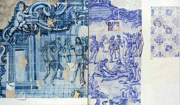 Na peça de 1993, Propostas para uma catequese: morte e esquartejamento (Figura 1), o significado global da obra surge das múltiplas referências com as quais foi construída a imagem. Varejão afirma, citando Severo Sarduy: “o meu trabalho é como uma câmara de ecos”. Inicialmente, damo-nos conta de que essa peça imita azulejos da tradição portuguesa. Em seu centro, encontramos a figura de Cristo, que assiste a uma cerimônia de antropofagia da qual é também o protagonista. As imagens de canibalismo, não a de Cristo, evidentemente, foram tomadas das ilustrações do livro Américae, de Theodore de Bry, do século XVI. Cristo está a ponto de receber o golpe fatal que o levará a ser devorado pelos indígenas, como se pode ver do lado direito da peça. Sobre a cena há um rótulo em latim: Qui manducat mean carnem e bibit meum sanguinem ia me manet, et ego in illo (Quem coma da minha carne e beba do meu sangue estará em mim e eu nele). É uma referência a uma citação evangélica que alude ao sacramento da comunhão, junto a uma ilustração explícita do que se diz simbolicamente. O que parece uma simples ironia provocadora é apenas uma justificativa do comportamento indígena diante do inimigo ou do mal, que, como explicava Lévi-Strauss, incorpora-o ao grupo em vez de expulsá-lo, como no Ocidente: antropofagia versus antropoemética (do grego emein, vomitar). A própria artista, em entrevista concedida a Felipe Scovino, em dezembro de 2008, comenta que o significado da obra “eram os índios ensinando a antropofagia aos portugueses, dando-lhes uma lição de catequese, uma contracatequese” (Varejão apud Scovino, 2009, p. 207-231).