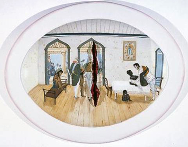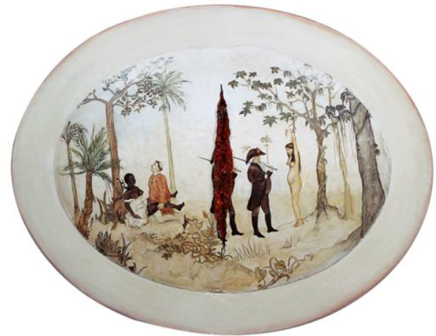As imagens são inspiradas nas gravuras da obra Voyage pittoresque et historique au Brésil, de Jean-Baptiste Debret, obra editada na França, em 1834. Trata-se de uma ilustração costumbrista, como era próprio da decoração das casas burguesas do século XIX: em meio de um agradável arvoredo, mostra-se fatos habituais, que naquele tempo não eram descritos, mas aconteciam. A elegante forma oval do quadro e sua paisagem bucólica contrapõem-se aos fatos revelados, enquanto uma mancha sangrenta atravessa a imagem, cortando-a como uma ferida aberta.