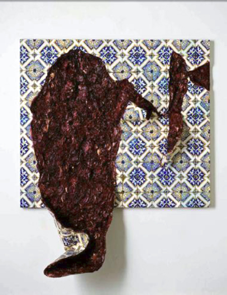 Na obra de 1998, Língua como padrão sinuoso (Figura 4), uma mancha se desprende de uma parede de azulejos, formosa e decorativa, e pode ser considerada como um símbolo não apenas da história do Brasil, mas de toda a América, de norte a sul, onde se implantou a civilização ocidental a sangue e fogo. Existe, sem dúvida, uma referência à iconografia da carne tratada por Rembrandt ou Goya, em Soutine ou Bacon, porém o significado aqui é diferente, pois sugere uma ferida aberta nas entranhas decorativas e amáveis da nossa civilização. Para terminar, veja-se a imagem da obra Em segredo, de 2003, onde se mostra a destruição de um povo e de uma cultura, como a indígena do Brasil, tal como se narra, poeticamente, em Yuxin, de Ana Miranda. Nesse caso é evidente a coincidência de ambas as perspectivas.