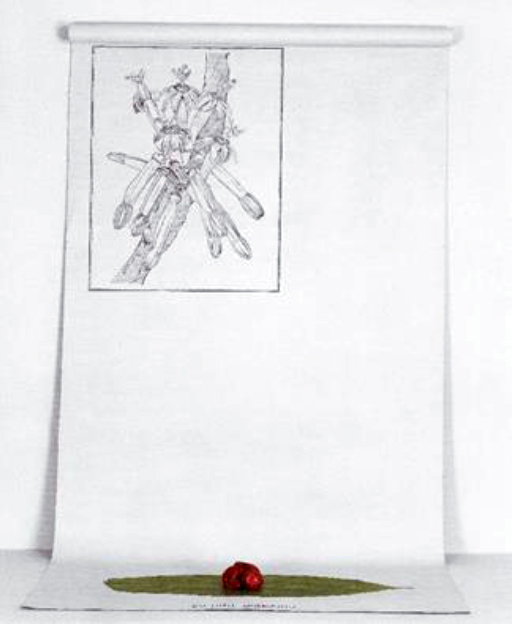 Na parte superior, à esquerda, vê-se uma ilustração possivelmente inspirada na obra de frei Cristovão de Lisboa, do século XVII, ou nas notas da expedição de Alexandre Rodrigues Ferreira, do século XVIII. Na parte inferior, encontra-se uma imagem de forte impacto emocional, em que a morte ladeia o nascimento. Abaixo, uma realidade sangrenta e, acima, a imagem da floresta representada por uma reprodução botânica de séculos pretéritos. A artista parece querer dizer que a realidade é hoje uma cara irônica do que antes foi, um canto ferido, um anjo da história, como aquele do qual falava Walter Benjamin, que observa o passado com as asas desdobradas enquanto acumulam-se ruínas a seus pés.