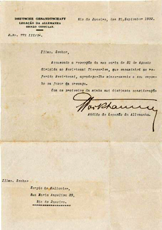 No capítulo 11, Ciccio descobre uma carta do Consulado da Alemanha - a qual, além de transcrita, também foi fotografada e incluída no livro, como primeira intrusão comprovada do contexto biográfico. Curiosamente, o documento verídico (Figura 1) mostra que, para as autoridades alemãs, a grafia do sobrenome de seu pai era, erroneamente, “Hollander”, nome comum na Alemanha, em lugar de “Holanda”, nome que seria desconhecido, sendo que o erro se explica, em parte, porque a pronúncia alemã das duas palavras seria igual. Aparentemente, o correspondente estrangeiro Sérgio Buarque de Holanda nunca sentiu a necessidade de corrigir o erro - ou temia as consequências burocráticas. O mais importante, porém, é o conteúdo. A carta se refere a uma anterior, datada do dia 31 de agosto de 1932, que trata da negociação do pagamento pelo pai de uma pensão alimentícia em benefício do filho alemão ou, como alternativa sugerida por Sérgio, de providenciar a mudança da criança para o Rio às suas custas. O narrador encontra também uma foto de Anne (não reproduzida no livro) - para espanto dele, em nada parecida com Mme Beauregard.