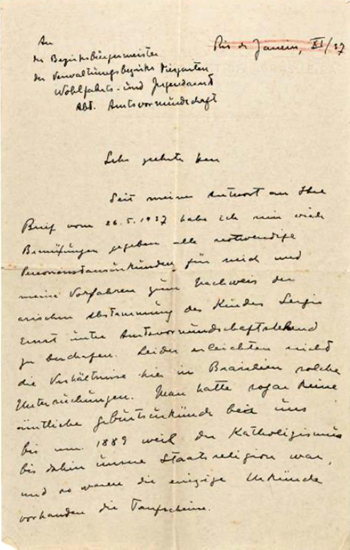 No capítulo 14, a polícia também invade a casa da família, após a prisão de seu irmão. Como efeito colateral da revista policial, o narrador encontra rascunhos de uma carta do pai (reproduzida no livro, Figura 2) em resposta a uma carta oficial da prefeitura de Berlim, solicitando comprovantes tanto de sua origem ariana quanto de seus ascendentes, necessárias para a adoção do filho por outro casal alemão.