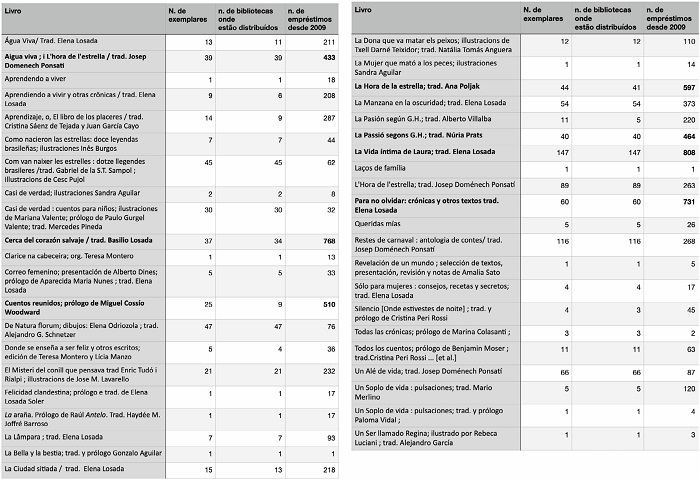 Os títulos destacados são os com o maior número de empréstimos. O mais lido é o infantil A vida íntima de Laura, presente no maior número de bibliotecas. Em segundo lugar está Perto do coração selvagem, em tradução para o espanhol de Basilio Losada, um dos primeiros tradutores de Lispector na Espanha 2 e pai de Elena Losada, de quem falaremos adiante ao comentar sua entrevista e tradutora também do volume de crônicas que está entre os três mais lidos nas bibliotecas. A hora da estrela é o quarto mais lido, seguido de um volume que reúne A hora da estrela e Água viva em catalão, traduzidos por Josep Domenèch Ponsatí.