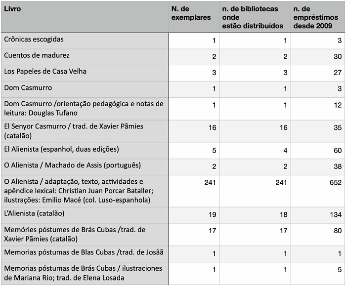 Por sempre ter considerado Machado de Assis nosso autor mais internacionalizado 3, fiz uma pesquisa para saber o número de empréstimos de seus livros e surpreendi-me com o resultado, em comparação com Clarice Lispector. O alienista foi o livro mais procurado, na sua versão adaptada, didática, com 652 empréstimos, distribuídos por 241 bibliotecas; também L'alienista, em catalão, com 134 empréstimos em 18 bibliotecas, e em espanhol, com 60 empréstimos em quatro bibliotecas, seguido de Memórias póstumas de Brás Cubas, em catalão, com 80 empréstimos em 17 bibliotecas, e El senyor Casmurro, com 35 empréstimos em 16 bibliotecas, também em catalão.