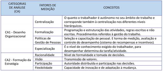 Para analisar os resultados do estudo qualitativo, apresenta-se, no Quadro 1, a descrição das categorias de análise (CA), com seus fatores de medição e respectivos conceitos. Pretendemos, a partir dos fatores de medição, responder à proposição inicial deste trabalho, verificando se os dados ou fatos observados na prática se encaixam com as proposições formuladas teoricamente.