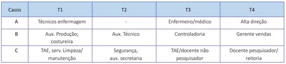 Mesmo que as características de cada tipo de trabalho estejam presentes em cada um dos casos (com exceção de T2 no caso A), a forma de administrá-los não foi encontrada conforme o previsto na proposição teórica. A justificativa pode estar na falta de conhecimento dos gestores, principalmente no Caso A e C, que são organizações de setores específicos (saúde e educação), nos quais o profissional de gestão tem sua formação em área técnica.