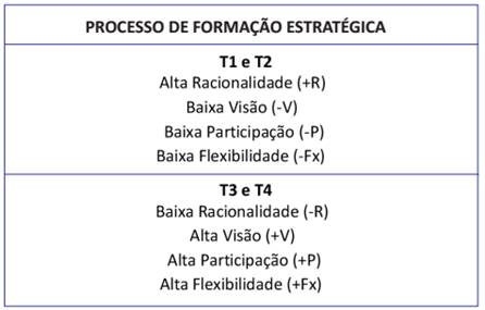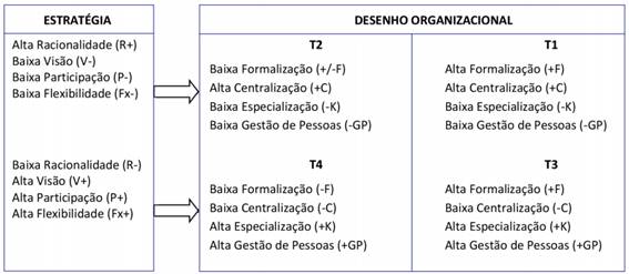 Pa: Para T1 rotineiro: altos níveis de formalização e de centralização; altas políticas funcionais e baixas políticas complementares de gestão de pessoas e baixa especialização - ajustam-se com alta racionalidade e baixa participação, visão e flexibilidade (estratégia deliberada);