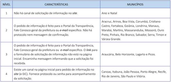 A expectativa de encontrar estruturas digitais apropriadas para o envio de solicitação de informações aos municípios e de receber respostas satisfatórias sobre os dados institucionais das Controladorias-Gerais dos Municípios não se confirmou, levando à conclusão de que nas estruturas das administrações públicas locais há diferentes estágios de cumprimento das determinações da LAI. Assim sendo, foram tipificados quatro estágios para a solicitação de pedidos de informação e quatro estágios para o fornecimento de respostas às informações solicitadas.