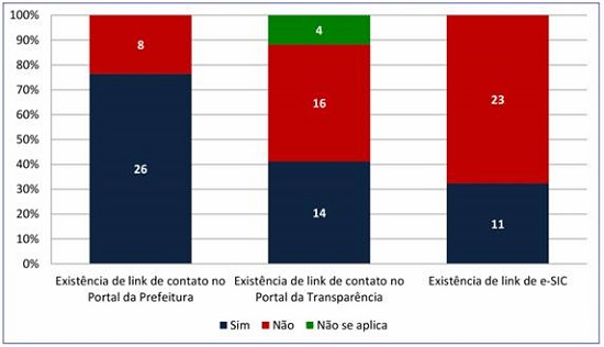 Já em relação à existência de um link de contato no Portal da Transparência, os resultados encontrados foram ainda piores. Apenas 14 municípios da amostra (41%) possuem um link de contato no Portal da Transparência, indicando que, na maioria dos casos, o usuário do Portal da Transparência tem que abrir o Portal da Prefeitura para fazer o pedido de acesso a informações. Em relação ao e-SIC, 11 municípios (32%) que replicaram o modelo da CGU de criação de canais centralizados de atendimento ao cidadão pela Internet o que facilita atender, orientar o público quanto ao acesso a informações, informar sobre a tramitação de documentos, e protocolar documentos e requerimentos de acesso a informações. Daqueles municípios que replicam o modelo de e-SIC, diversos utilizam o mesmo logotipo do governo federal.