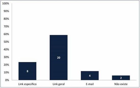 Em 26 municípios (76%), é possível identificar um link de contato (Fale Conosco, e-SIC, Formulário ou E-mail) no Portal da Prefeitura (Gráfico 1). Considerando a abrangência do que foi considerado como link de contato, entretanto, é alto o número de municípios que não disponibiliza nenhum tipo de contato em seu portal (24%). Observou-se, ainda, que, em alguns casos, encontrar esses canais de comunicação não se revelou uma tarefa fácil, exigindo a consulta em várias páginas do site da Prefeitura, mostrando que a localização desses canais necessita ser mais acessível.
