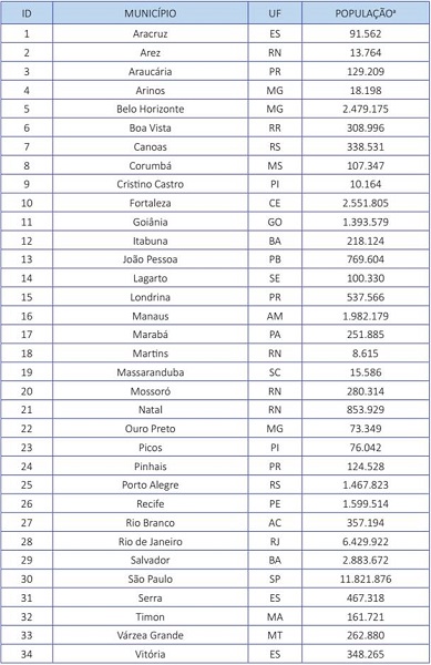 Desta forma, para definir a amostra do estudo, foi realizada uma pesquisa em uma ferramenta de busca virtual (Google) utilizando o termo "Controladoria-Geral do Município", no dia 05 de outubro de 2013. Foram analisadas as primeiras 15 páginas de resultados, uma vez que, a partir da décima segunda, não se encontrou mais nenhuma estrutura de CGM listada nos resultados. Ao final, foram localizadas trinta e quatro controladorias municipais (Tabela 1).