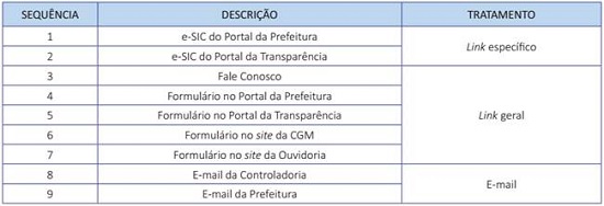Em função de várias localidades não disponibilizarem o link do e-SIC na primeira página do seu portal, o pedido de informação foi encaminhado ao Portal da Transparência. Havia, contudo, uma incidência grande de municípios em que o e-SIC ou o Portal da Transparência não dispunham de formulário para contato. Nesses casos, foi encaminhado, por meio de formulário ou correio eletrônico, à prefeitura, à CGM, à Ouvidoria ou ao Fale Conosco. Em um caso, solicitava-se que o formulário fosse levado pessoalmente à prefeitura, o que inviabilizou o seu envio. Uma segunda localidade não tinha formas de contato eletrônico e telefônico (nesse caso específico, pesquisou-se em redes sociais da prefeitura, mais especificamente, no Blog e no Facebook para a obtenção do telefone; ao final, a solicitação foi encaminhada para os e-mails pessoais do chefe de Gabinete do Prefeito e da Controladora Municipal). É recomendável que a LAI seja regulamentada por um decreto ou lei de âmbito municipal. Entretanto, muitos municípios não estabeleceram as regras para o seu funcionamento, o que dificultou a identificação do canal de acesso para a solicitação de informação. Não há um padrão único a todas as localidades, uma vez que a lei só determina que o município deve propiciar qualquer meio de contato eletrônico para que o munícipe faça seu pedido de informação.