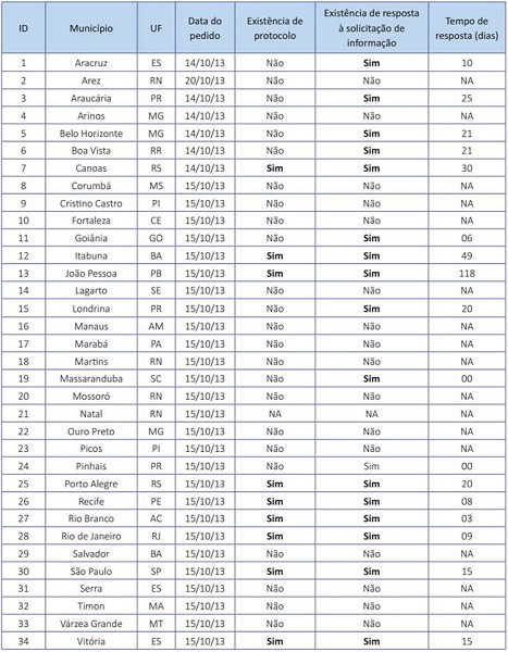 Dos 34 municípios analisados, apenas nove (26%) fornecem um número de protocolo ao pedido de informação feito, conforme preconizado na LAI (art. 9º, inciso I, c). Quatro deles, contudo, mesmo não fornecendo número de protocolo, informaram por e-mail que a mensagem havia sido recebida. Os demais (62%) não concedem nenhum comprovante do pedido feito, deixando o usuário sem a certeza de que a solicitação realmente chegou ao órgão demandado. A ausência de um número de protocolo a um pedido de informações gera duas dificuldades: para o cidadão, impossibilita o acompanhamento da solicitação feita; para a administração pública, impossibilita a auditoria da eficiência e eficácia dos canais de comunicação existentes entre cidadão e burocracia. Acredita-se que não é mero acaso o fato de que todos os nove municípios que ofereceram um protocolo ao pedido de informação responderam o pedido.