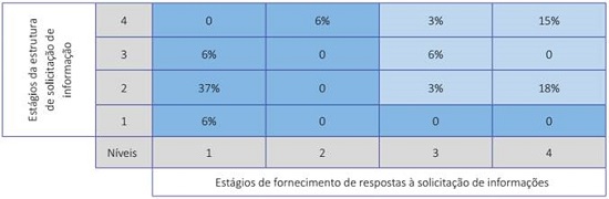 Quando se faz uma análise conjunta das duas gradações determinadas, é possível identificar variadas combinações que se relacionam com o cumprimento ou não cumprimento das determinações da Lei de Acesso à Informação. Qualquer combinação entre os níveis 2, 3 ou 4 dos estágios da estrutura de solicitação de informações com os níveis 3 ou 4 dos estágios de respostas à solicitação de informações demonstram o cumprimento da LAI em relação à transparência passiva. Outras combinações entre os dois estágios, no entanto, demonstram que o município não cumpre as determinações da LAI em relação aos pedidos de acesso à informação. Dito de outra forma, desde que o município ofereça qualquer meio digital de pedido de informações e cumpra o prazo máximo estipulado para oferecer uma resposta ao solicitante (até 30 dias), é possível afirmar que o município está agindo dentro de um arcabouço legal.