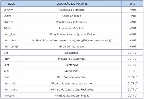As variáveis utilizadas para analisar a eficiência das unidades estão na Quadro 2: