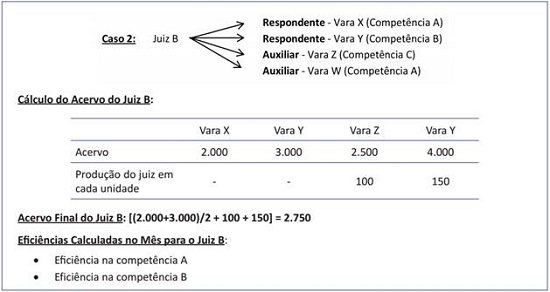 Juiz sem titularidade e com respondência: nesses casos, como o magistrado não possui um acervo permanente sob sua responsabilidade, o mesmo dividirá o acervo da unidade em que estiver respondendo, juntamente com os demais juízes que nela atuarem e que também devam entrar na divisão. Contudo, caso o magistrado esteja também auxiliando em alguma outra unidade, esta não entrará na divisão total do acervo, sendo a ele adicionado apenas o quantitativo de processos referentes às sentenças em que tiver proferido na unidade em que respondeu. Segue-se o exemplo da Figura 2: