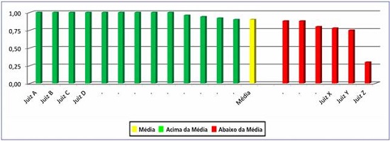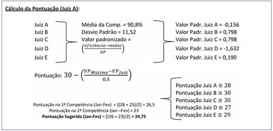 Observe-se que a pontuação do juiz é calculada dentro de cada mês, sempre o comparando com o desempenho dos juízes da mesma competência. A pontuação é calculada por meio da seguinte normalização: