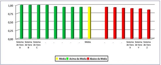 Em seguida, mostra-se o gráfico com o ranking das eficiências, com a média sendo mostrada e evidenciando as comarcas que estão acima ou abaixo da média, conforme se verifica no Gráfico 3. Este gráfico demonstra na prática uma das principais funções da DEA que consiste na ideia de benchmarking, fazendo com que as unidades eficiências sirvam de referências para as demais unidades (PEÑA, 2008; NOGUEIRA, OLIVEIRA, VASCONCELOS et al., 2012).
