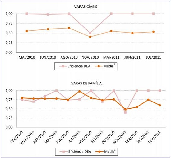A recomendação pela efetuação de estudos com o DEA na Administração Pública foi proposta detalhadamente por Peña (2008). No caso do Judiciário brasileiro, os dados coletados pelo relatório Justiça em Número permitiram a realização, no cenário nacional, de estudos que adotaram a DEA para avaliação da eficiência dos tribunais estaduais conforme vistos nos trabalhos de Fochezzato (2010), Yeung (2010), Yeung e Azevedo (2011) e, mais recentemente, em Nogueira et al. (2012). A adoção do DEA por parte da academia serviu como referência para a utilização desta metodologia por parte do CNJ. A edição de 2012 do relatório Justiça em Números realizou um trabalho preliminar ao utilizar a DEA na medição da eficiência dos Tribunais de Justiças estaduais (TJs) e dos Tribunais Regionais do Trabalho (TRTs) (DPJ, 2012). No entanto, na edição de 2013 foi oficialmente criado o Índice de Produtividade Comparada (IPC-JUS). Este se utiliza da DEA, classificando os tribunais de forma agrupada conforme o porte e o volume de demanda processual (DPJ, 2013).