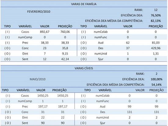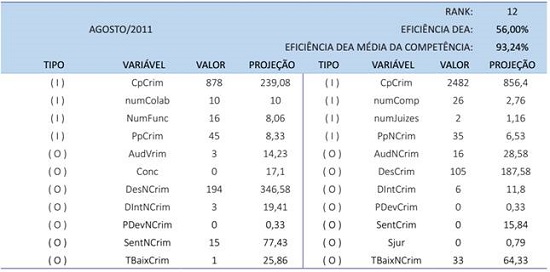 Projeções mensais dos níveis ótimos de cada variável envolvida na análise da eficiência, calculadas a partir da análise envoltória de dados, as quais servem de norteamento ao magistrado do que ele deve melhorar e do quanto ele precisa incrementar sua produção para atingir índices maiores de eficiência (conforme Tabela 1):