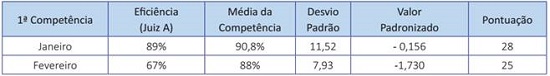 Suponha-se que o Juiz A teve sua eficiência calculada para o período de 02 meses. A Tabela 3 mostra os resultados de sua eficiência, a média e o desvio padrão da competência, bem como o valor padronizado e a pontuação.