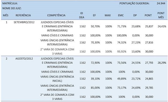 Ressalta-se, finalmente, que, se o magistrado tiver atuado em mais de uma competência no período, sua pontuação é calculada dentro de cada uma delas, considerando a respectiva média e desvio padrão, de forma que a pontuação mensal é dada pela média das pontuações obtidas nas diversas competências em que o juiz tiver atuado. A pontuação final do período, por sua vez, é obtida a partir da média das pontuações mensais.