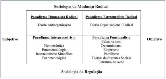 Para classificar as teorias, Burrell e Morgan (1979) utilizaram duas abordagens da ciência: a subjetiva e a objetiva, alicerçadas em quatro importantes estruturas científicas: 1) a ontologia (analisa os pressupostos e resultados metafísicos das ciências); 2) a epistemologia (estuda a filosofia da ciência); 3) a natureza humana (visão do homem sobre a realidade); e 4) a metodologia (estuda os métodos de investigação científica), bem como duas visões sobre o processo de mudança na sociedade: 1) a sociologia da mudança radical, onde existe preocupação com problemas de mudança, conflito e coerção nas estruturas sociais, enfatizando divisão, hostilidade, dissenso e desintegração; 2) a sociologia de mudança regulada, onde o equilíbrio social enfatiza o compromisso, a coesão, a solidariedade, o consenso, a reciprocidade, a cooperação, a integração, a estabilidade e a persistência. Podemos sintetizar os quatro paradigmas da seguinte forma: