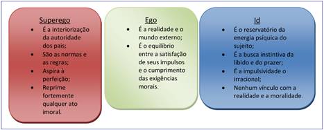 Nesse esquema freudiano, constam as seguintes estruturas psíquicas: Superego (em que o nível psíquico é parcialmente inconsciente), Ego (também parcialmente inconsciente) e Id (em que o nível psíquico é totalmente inconsciente).