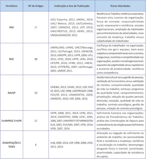 O universo da pesquisa teve como base trabalhos acadêmicos apresentados sob a forma de dissertações ou teses de doutorado que fazem parte do banco de dados de periódicos da Capes, trabalhos constantes dos anais do Enanpad e do EnGPR, bem como artigos publicados nas revistas RAE, RAC e RAUSP. Um conjunto de 59 trabalhos foi considerado para a análise mais detalhada após o exame dos resumos de cada um dos trabalhos que compõem o universo da pesquisa.