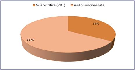 No Gráfico 2, fica explícito o total de trabalhos analisados nas linhas funcionalista e crítica (PDT), na subcategorização de autores funcionalistas e críticos em moderados e radicais.