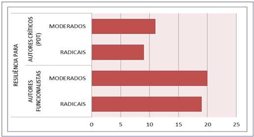 Baseada nesses termos associados ao conceito de resiliência e na frequência com que foram descritos nos trabalhos analisados, foi relevante a elaboração de subcategorias dentro dos autores das linhas funcionalista e crítica (PDT).