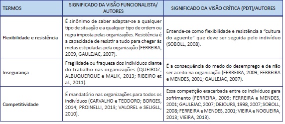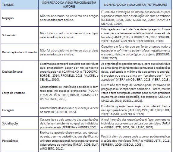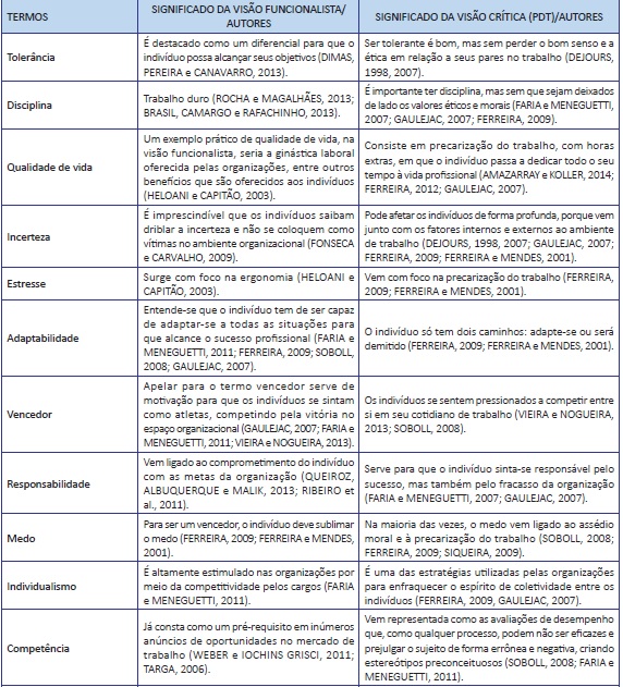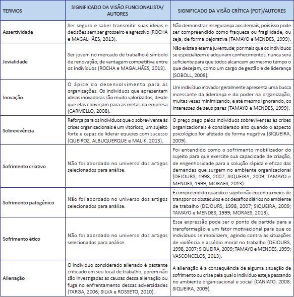 O Quadro 4 apresenta as análises interpretativas dos termos encontrados na pesquisa, tanto na visão funcionalista quanto na visão crítica.