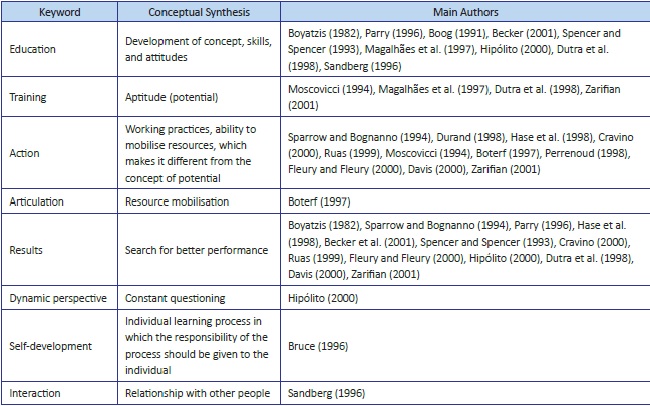 However, the conceptual multiplicity is even greater. Brito, Paiva, and Leone (2012), using theoretical studies, presented this plurality when defining competencies, relating keywords, conceptual synthesis, and its main authors as seen in Box 1.