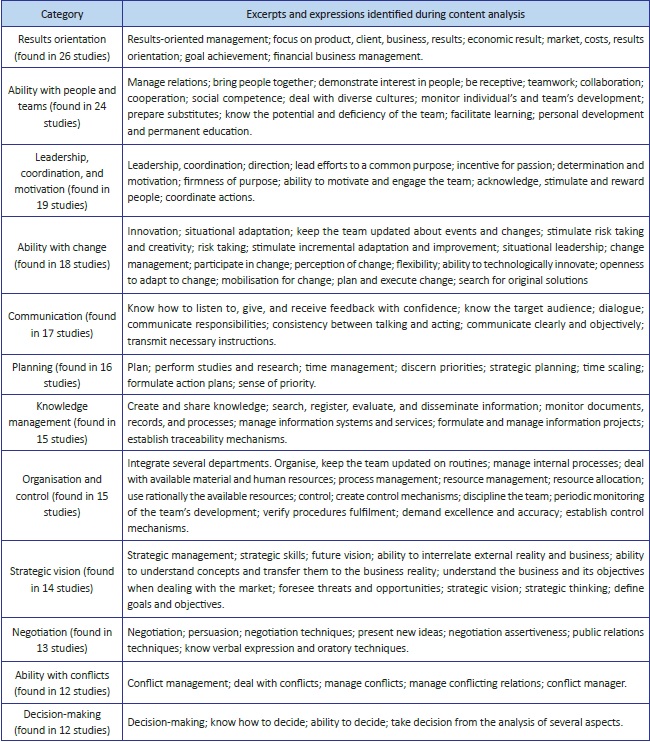 This is a bibliographic study with a posteriori classification of content analysis. The parametrisation of the bibliographic research prioritised articles published between 2005 and 2015 available at journal web portals such as CAPES, Scielo, ProQuest, Web of Science, and Google Scholar, containing expressions such as skill, competence, competences, competencies, managerial skill, managerial skills, managerial competence, managerial competences, and managerial competencies in the title, abstract, or keywords.