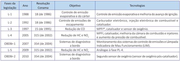 As tecnologias patenteadas e introduzidas nos automóveis dos EUA, da Europa e de alguns países asiáticos serviram para cumprir a regulamentação de cada uma dessas regiões, passando em uma etapa seguinte a equipar os veículos brasileiros, cumprindo, assim, os padrões de emissões do PROCONVE. Algumas tecnologias identificadas podem ser associadas às diversas fases desse programa. Na fase L-1, os veículos passaram a ter o controle de emissão evaporativa, que inclui o controle de emissões do cárter. Entre as fases L-2 e L-3 ocorreu a introdução do maior número de dispositivos nos motores, como controle de dosagem de combustível, sistema de injeção de combustível, sensores de oxigênio e catalisador. Durante a regulamentação das fases L-4 e L-5, os motores passaram a ter o monitoramento eletrônico OBD II, regulamentado no Brasil como “OBDBr-1” (2007 a 2009) e “OBDBr-2” (2010 e 2011), que passou a equipar 100% dos veículos nacionais produzidos desde 2011 (CONAMA, 2004).
