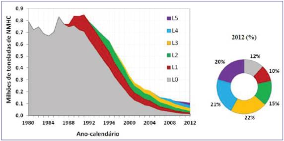 A Figura 3 mostra a evolução das reduções das emissões de NMHC por automóveis e veículos comerciais leves de IC, da frota nacional, por fase do PROCONVE. Os valores são em milhares de toneladas de NMHC, com destaque para a distribuição porcentual em 2012 das emissões de cada fase do PROCONVE, e na figura pode ser observada a redução dessas emissões a partir de 1992, após a introdução da Fase L-2.