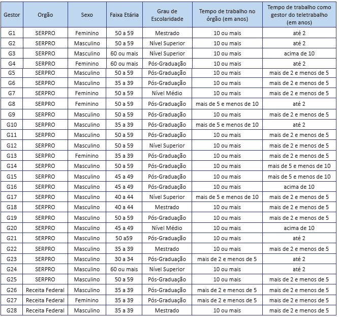A segunda parte da pesquisa contou com entrevistas com os gestores, conduzidas com base em um roteiro semiestruturado que abordou suas percepções de acordo com as seguintes categorias: a) implantação do teletrabalho no órgão público; b) processo de seleção do teletrabalho; c) vantagens e desvantagens do teletrabalho para o gestor e o teletrabalhador; d) vantagens e desvantagens do teletrabalho para o órgão público; e) supervisão dos teletrabalhadores; e f) sistema de avaliação de desempenho dos trabalhadores.