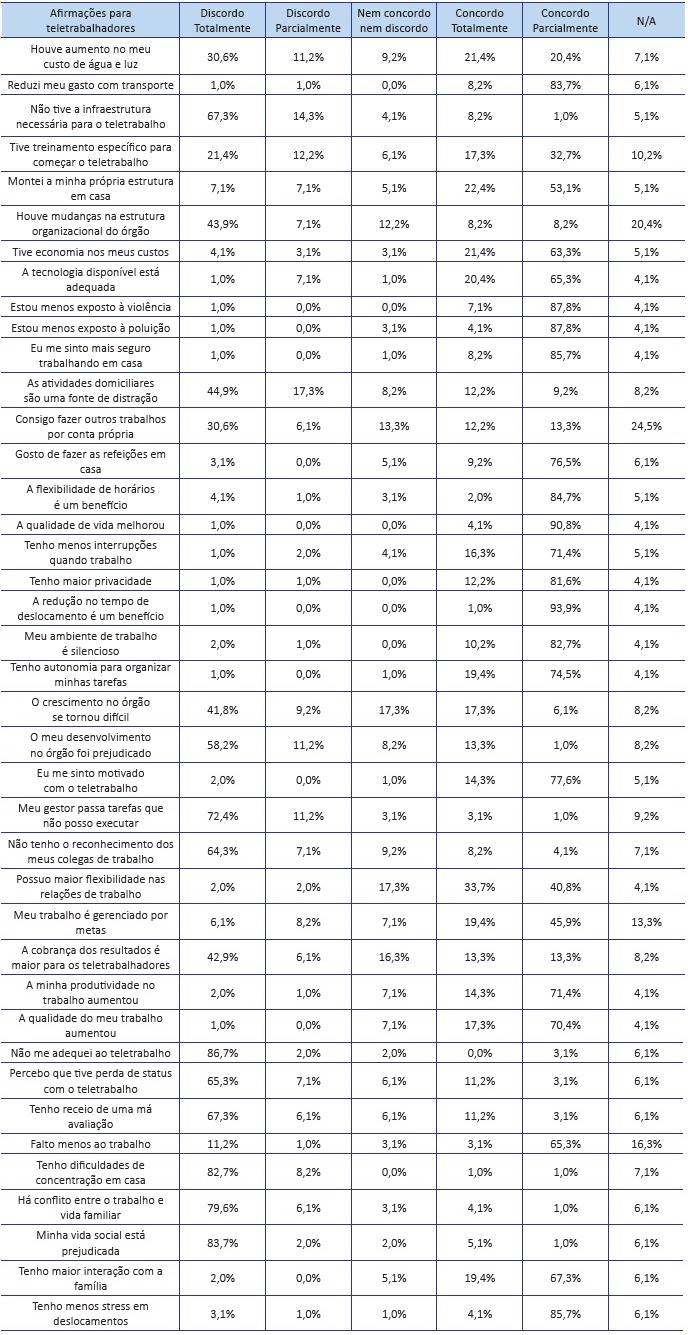 A Tabela 1 apresenta os percentuais de discordância/concordância das afirmações dos teletrabalhadores sobre os indicadores classificados na Quadro 2 e, para efeitos de análise, em alguns casos foram somados os resultados das alternativas “concordo parcialmente” e “concordo totalmente”, assim como “discordo parcialmente” e “discordo totalmente”.