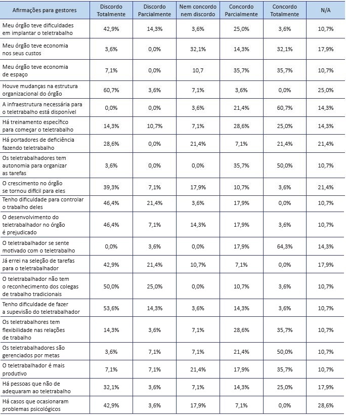 No tocante às vantagens e desvantagens, 85,7% dos gestores acreditam que os teletrabalhadores têm autonomia para organizar tarefas, 82,2% afirmam que eles se sentem motivados para o teletrabalho e 64,3% que eles têm flexibilidade nas relações de trabalho. Por outro lado, 21,5% acham que o desenvolvimento dentro do órgão ficou prejudicado e 14,1% acreditam que eles não são reconhecidos pelos colegas de trabalho.