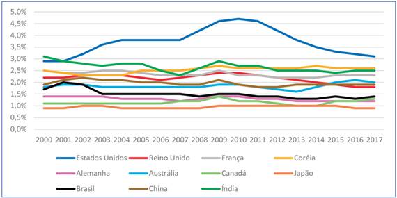 A Figura 1 apresenta despesas militares por país entre 2000 e 2017, em percentagem do Produto Interno Bruto (PIB), dos países selecionados. Os Estados Unidos possuem a maior taxa. Percebe-se a evolução da Coreia, que terminou o ano de 2017 com a segunda maior taxa entre os países presentes na amostra. Evidencia-se a evolução de algumas economias emergentes, como China, Índia e Brasil. Isso pode ser explicado pelo fato de algumas economias emergentes buscarem reduzir sua dependência de outras nações, melhorar sua segurança nacional e incentivarem o desenvolvimento de suas indústrias locais, adquirindo capacidades tecnológicas relacionadas à defesa (BITZINGER, 2013). Contudo, nota-se que o Brasil ainda possui uma taxa baixa quando comparada a outros países.