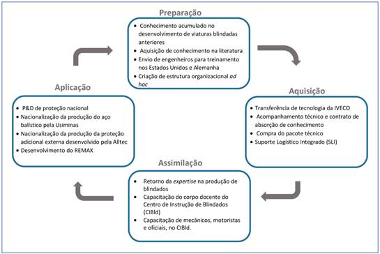 A Figura 19 mostra o ciclo de aprendizagem tecnológica do projeto da Nova Família de Blindados sobre Rodas (NFBR). Na etapa de preparação, o Exército procurou retomar o conhecimento acumulado nos projetos anteriores de viaturas blindadas desenvolvidos em parceria com a empresa Engesa, como a VBTP-MR Urutu, Cascavel e Osório (BASTOS JÚNIOR, HIGUCHI e BACCHI, 2015). O início do projeto também foi marcado pelo processo de seleção de tipos de profissionais necessários. A maioria dos engenheiros e profissionais do Exército não possuía experiência no desenvolvimento de viaturas blindadas, então a preparação dos profissionais ocorreu de duas formas: aquisição de conhecimento na literatura; envio de um grupo de profissionais para especialização nos Estados Unidos e na Alemanha. Por meio das interações proporcionadas pela estrutura organizacional ad hoc, que facilitou o compartilhamento de conhecimento entre os profissionais, o Exército realizou atividades como testes de performance e engenharia.